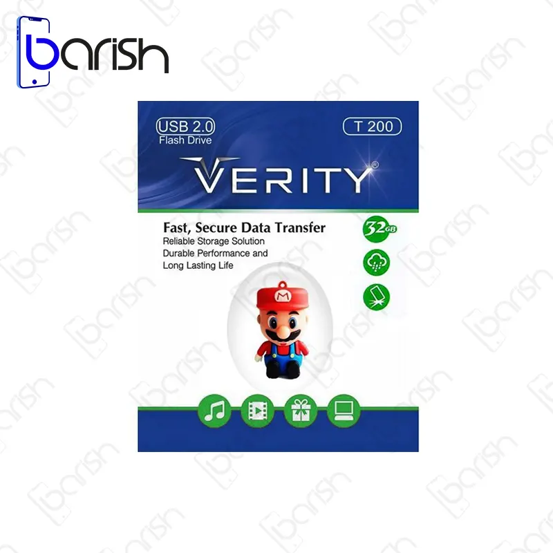 معمولا فلش مموری ها برای ذخیره و جابجایی اطلاعات استفاده می شوند و هر چقدر حجم اطلاعات قابل جابجایی بالاتر باشد کارایی فلش مموری بالا تر می باشد. فلش مموری عروسکی وریتی مدل T200 با ظرفیت 32 گیگابایت می باشد که با داشتن بدنه ای مقاوم و داشتن محافظ فلش در مقابل انواع آسیب های بیرونی همچون گرد و غبار و شوک، از مقاومت کافی برخوردار باشد.