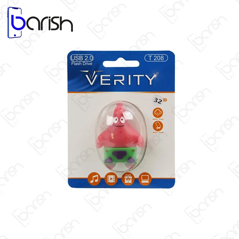 معمولا فلش مموری ها برای ذخیره و جابجایی اطلاعات استفاده می شوند و هر چقدر حجم اطلاعات قابل جابجایی بالاتر باشد کارایی فلش مموری بالا تر می باشد. فلش مموری عروسکی وریتی مدل T208 با ظرفیت 32 گیگابایت می باشد که با داشتن بدنه ای مقاوم و داشتن محافظ فلش در مقابل انواع آسیب های بیرونی همچون گرد و غبار و شوک، از مقاومت کافی برخوردار باشد.