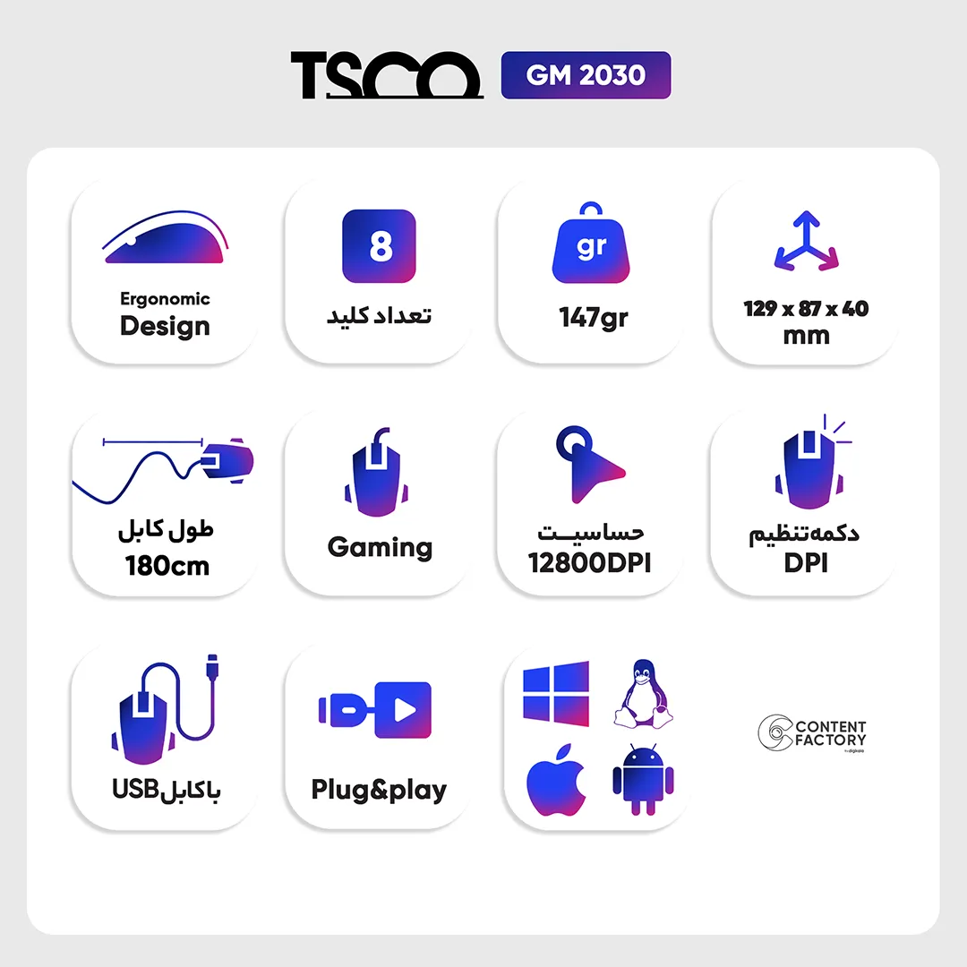 | سایر ویژگی ها | طراحی ارگونومیک / دارای نور RGB / دارای کلید تغییر DPI / بدون نیاز به نصب درایور |