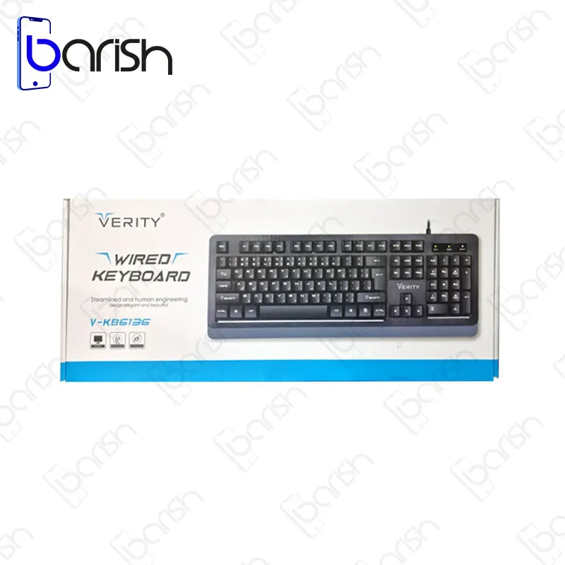 این کیبرد دارای 104 عدد کلید می باشد که بر روی کلید ها حروف فارسی حک شده است که به برچسب حروف فارسی نیاز نمی باشد. طراحی کیبرد سیمی وریتی مدل V-KB6136 ارگونومیک است که این نوع طراحی در هنگام استفاده طولانی مدت از کیبورد باعث خستگی دستان شما نمی شود. عمر ضربه پذیری کلید های این کیبرد حدودا 8 میلیون بار می باشد. این کیبرد مانند بقیه کیبردهای استاندارد دارای کلید های عددی در سمت راست صفحه کلید است.