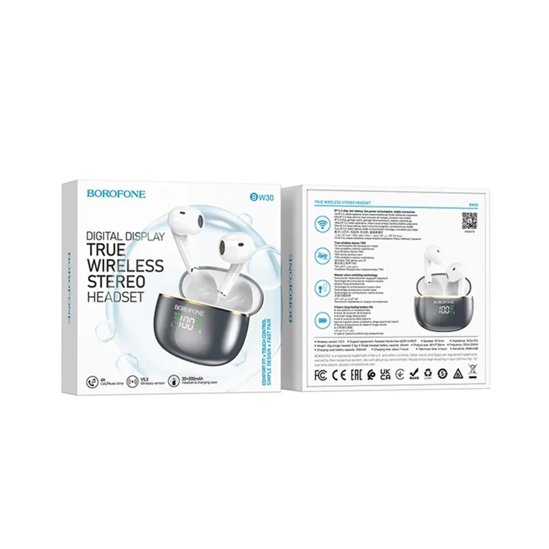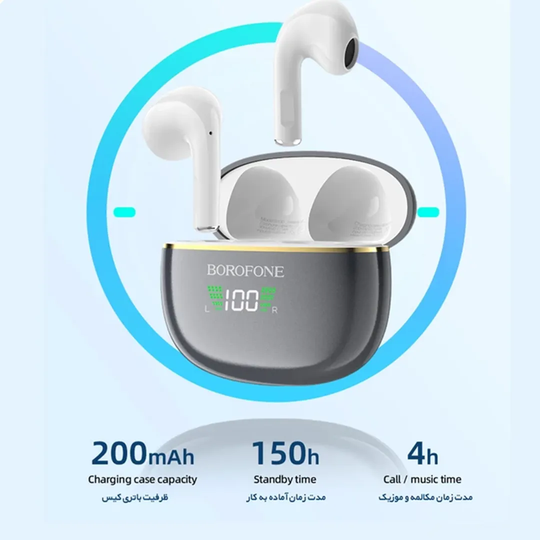هندزفری بلوتوثی بروفون مدل BW30 یک هندزفری بی سیم با رنگ خاکستری متالیک است. این هندزفری از طریق اتصال بی سیم به دستگاه شما متصل می شود. مدت زمان شارژ کامل آن حدود 1 ساعت است و مدت زمان مکالمه و پخش موسیقی آن حدود 4 ساعت است . ظرفیت باتری کیس آن 200 میلی آمپر ساعت و ظرفیت باتری هر کدام از ایرفون ها 30 میلی آمپر ساعت است.