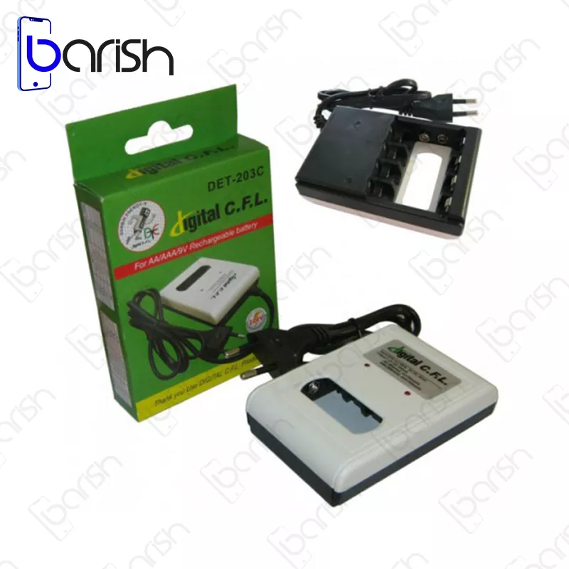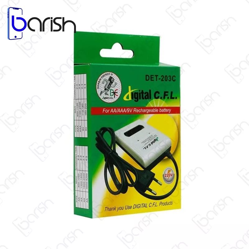 شارژر باتری 3 کاره دیجیتال C.F.L مدل DET-203C قابلیت شارژ باتری های با تکنولوژی NI-MH/NI-MH/NI-CD را دارد و با تشخیص خودکار نوع باتری ، جریان مناسب را به آن اعمال می کند و با نشانگر LED ، وضعیت شارژ را نشان می دهد . شارژر باتری CFL-203C با قطع خودکار شارژ پس از 12 ساعت ، از باد شدن یا خراب شدن باتری ها جلوگیری می کند . این شارژر مناسب برای باتری های با ظرفیت 800 الی 4200 میلی آمپر است . شارژر باتری 3 کاره دیجیتال C.F.L مدل DET-203C یک شارژر هوشمند با سرعت عالی است که با اتصال سریع به پایه باتری ، فرآیند شارژ را آغاز می کند .
