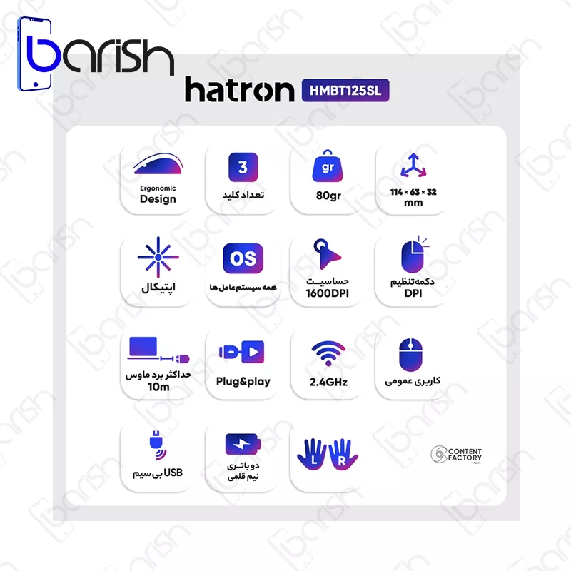 موس هترون مدل HMBT125SL با استفاده از یک دانگل USB به رایانه متصل می شود و برد اتصال آن تا 10 متر است . این موس با وزن 80 گرم و ابعاد 32*63*114 میلی متر، طراحی ارگونومیک و راحتی دارد و برای افراد راست و چپ دست قابل استفاده است .
