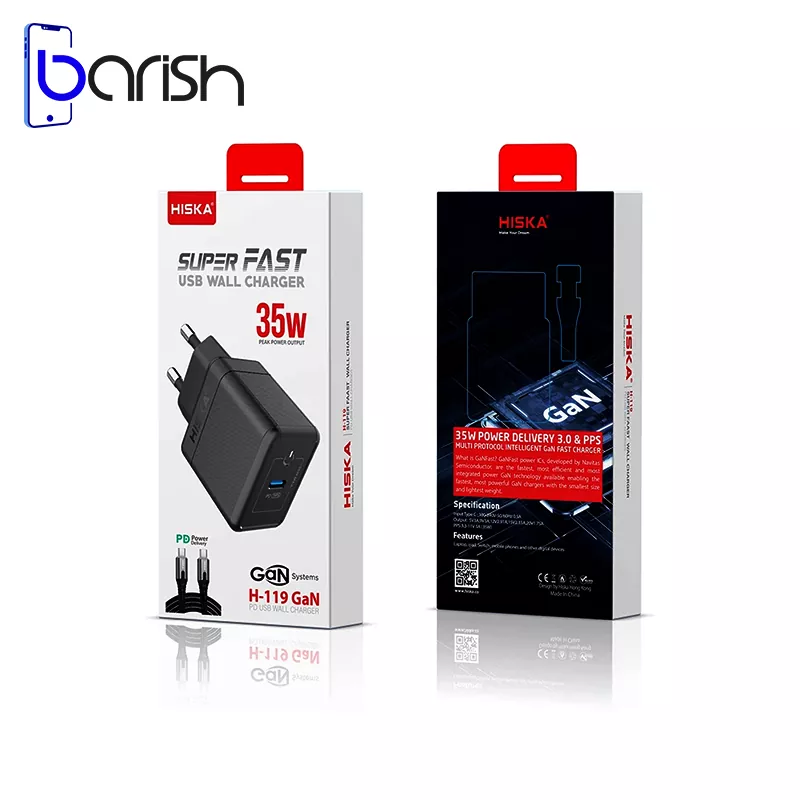 شارژر دیواری 35 واتی هیسکا مدل H-119GaN یک شارژر سریع و باکیفیت است که برای انواع دستگاههای دیجیتال مانند گوشیهای هوشمند ، تبلتها ، دوربینهای دیجیتال ، اسپیکرها و پاوربانکها مناسب می باشد . در ادامه به ویژگی های این محصول می پردازیم .