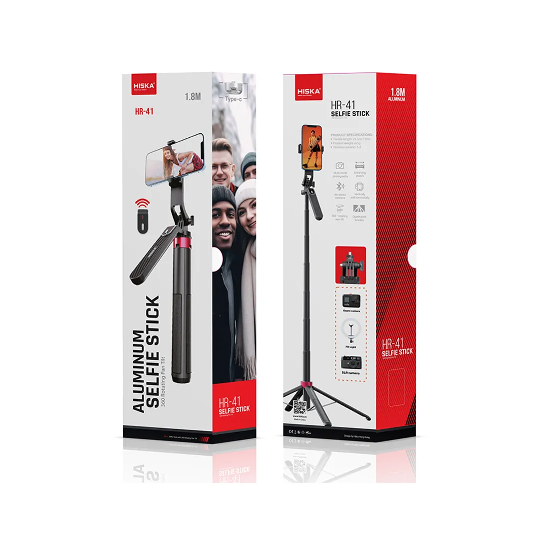 وزن این مونوپاد 425 گرم می باشد. مونوپاد هیسکا HR-41 دارای طراحی شیک و مستحکمی است. مواد استفاده شده در طراحی این محصول از پلاستیک ABS و آلومینیوم استفاده شده است. وزن این مونوپاد 425 گرم می باشد. این مونوپاد فضای کمی را اشغال می کند و به راحتی می توانید آن را داخل کیفتان همراه داشته باشید و عکس های زیبا ثبت نمایید. پایه های سه پایه را می توانید باز کرده و گوشی را روی این سه پایه در هر نقطه تنظیم کنید. پایه های آلومینیومی این سه پایه از استحام بسیار خوبی برخوردارند به راحتی روی هرسطحی قرار می گیرد و ثبات کافی دارد. پایه این مونوپاد به حالت تلسکوپی است و ارتفاع آن از 295 تا 1800 میلیمتر قابل تغییر است. همچنین این محصول دارای یک ریموت کنترل جهت اتصال به گوشی همراه شما میباشد.