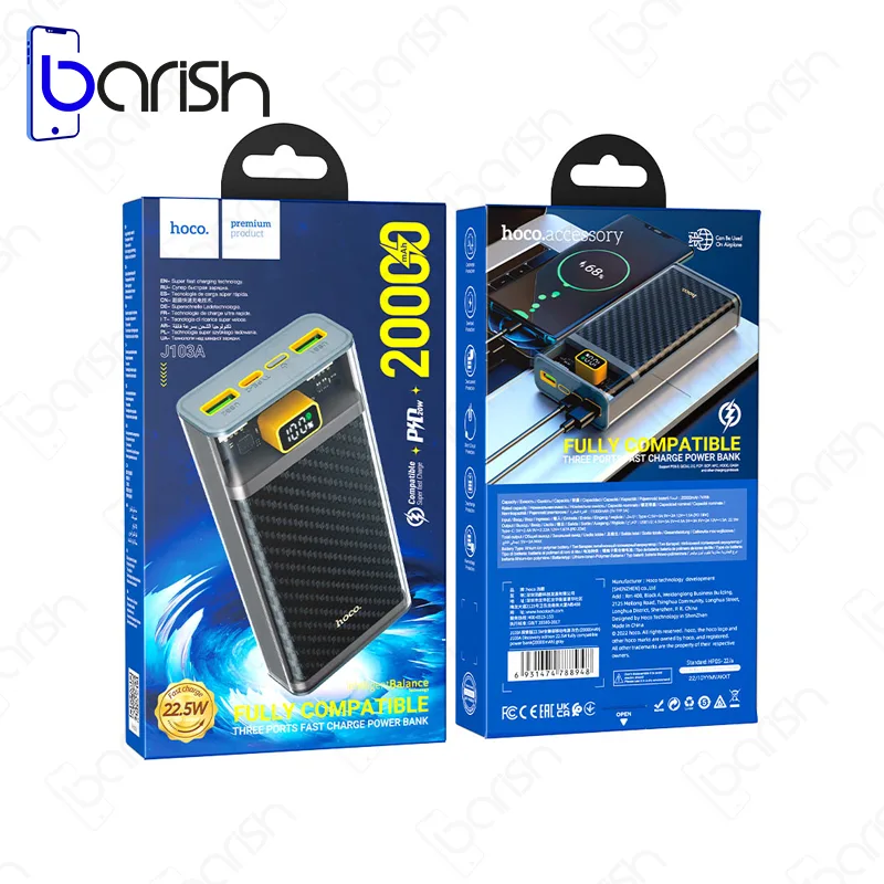 پاوربانک هوکو J103A یکی از گزینه های بسیار خوب در بازار است که از ظرفیت 20000 میلی آمپر ساعت، دو پورت خروجی USB-A و یک پورت خروجی USB-C با پشتیبانی از فناوری Power Delivery (PD) برخوردار است. این پاوربانک همچنین از فناوری Quick Charge 3.0 نیز پشتیبانی می کند که به شما امکان می دهد تا دستگاه های خود را با سرعت بیشتری شارژ کنید.