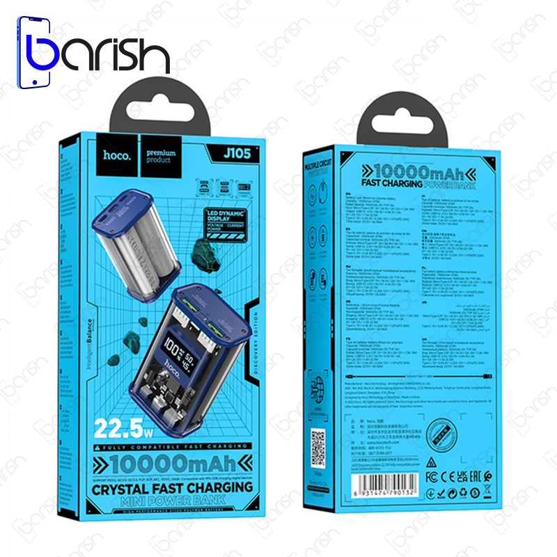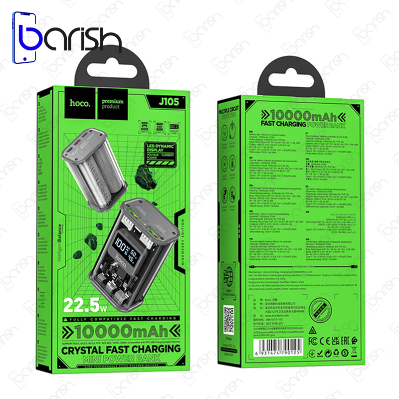 پاوربانک هوکو J105 یک شارژر همراه با ظرفیت 10000 میلی آمپر ساعت است که از فناوری شارژ سریع PD 22.5 و QC 3.0 پشتیبانی می کند. این پاوربانک دارای بدنه ای مقاوم و سیستم حفاظتی چندگانه است که آن را به یک گزینه مناسب برای کاربران مختلف تبدیل می کند.