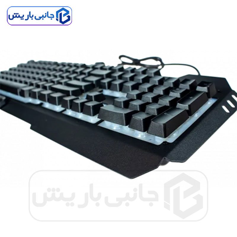 صفحه کلید گیمینگ با نور زمینه رنگین کمانی ظاهر چشمگیری به خود اختصاص داده است. این صفحه کلید، 104 کلید با طراحی استاندارد دارد که تعداد ضربه پذیری کلید ها 5 میلیون بار می باشد، که یک کلید مختص برای روشن و خاموش کردن نور زمینه RGB است البته در دو حالت نور زمینه قابل تنظیم است، این کیبورد دارای 14 کلید کلید مالتی مدیا برای سرعت بخشیدن به انجام کارها را دارد، طراحی کلید ها قابلیت ضدآب دارد و دارای جنس باکیفیت است که هنگام تایپ کردن احساس خستگی انگشتانتان را نمی کنید و یکی از بهترین ویژگی این کیبرد حکاکی حروف فارسی به لیزر را دارد ک در صورت استفاده مداوم حروف کم رنگ نمی شوند و نیازی به برچسب حروف فارسی نیست.