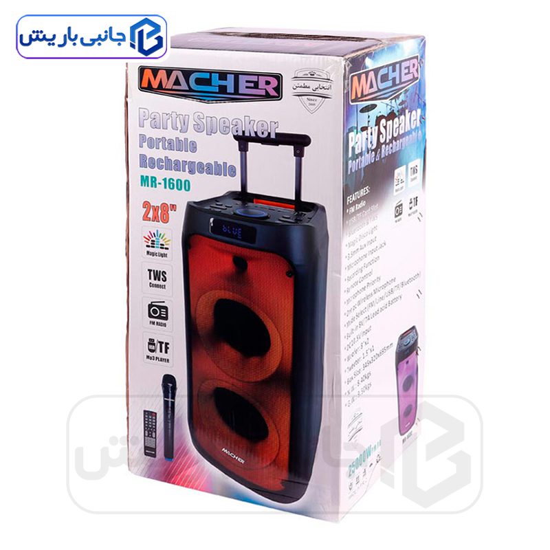 اسپیکرهای پارتی باکس مناسب برای پخش موسیقی در مجالس و فضاهای نسبتا بزرگ می باشد. اسپیکر چمدانی مچر مدل MR-1600 دارای یک دسته در قسمت بالای خود است که با استفاده از این دسته و چرخ هایی که در قسمت پایین اسپیکر وجود دارد به راحتی می توان جابه جا کرد؛ همچنین این پارتی باکس دارای نورپردازی RGB و رقص نور می باشد که جلوه ی بصری زیبا در نور کم و یا محیط تاریک ایجاد می کند. این اسپیکر به کلیدهای فیزیکی جهت مدیریت موسیقی، روشن و خاموش کردن اسپیکر و نورپردازی، تنظیم ولوم، تکرار آهنگ و … مجهز می باشد، همچنین اقلام همراه ای پارتی باکس شامل یک عدد میکروفون، یک عدد ریموت کنترل جهت مدیریت اسپیکر از راه دور و یک عدد آداپتور با کابل متصل سوزنی جهت شارژ نمودن اسپیکر است.