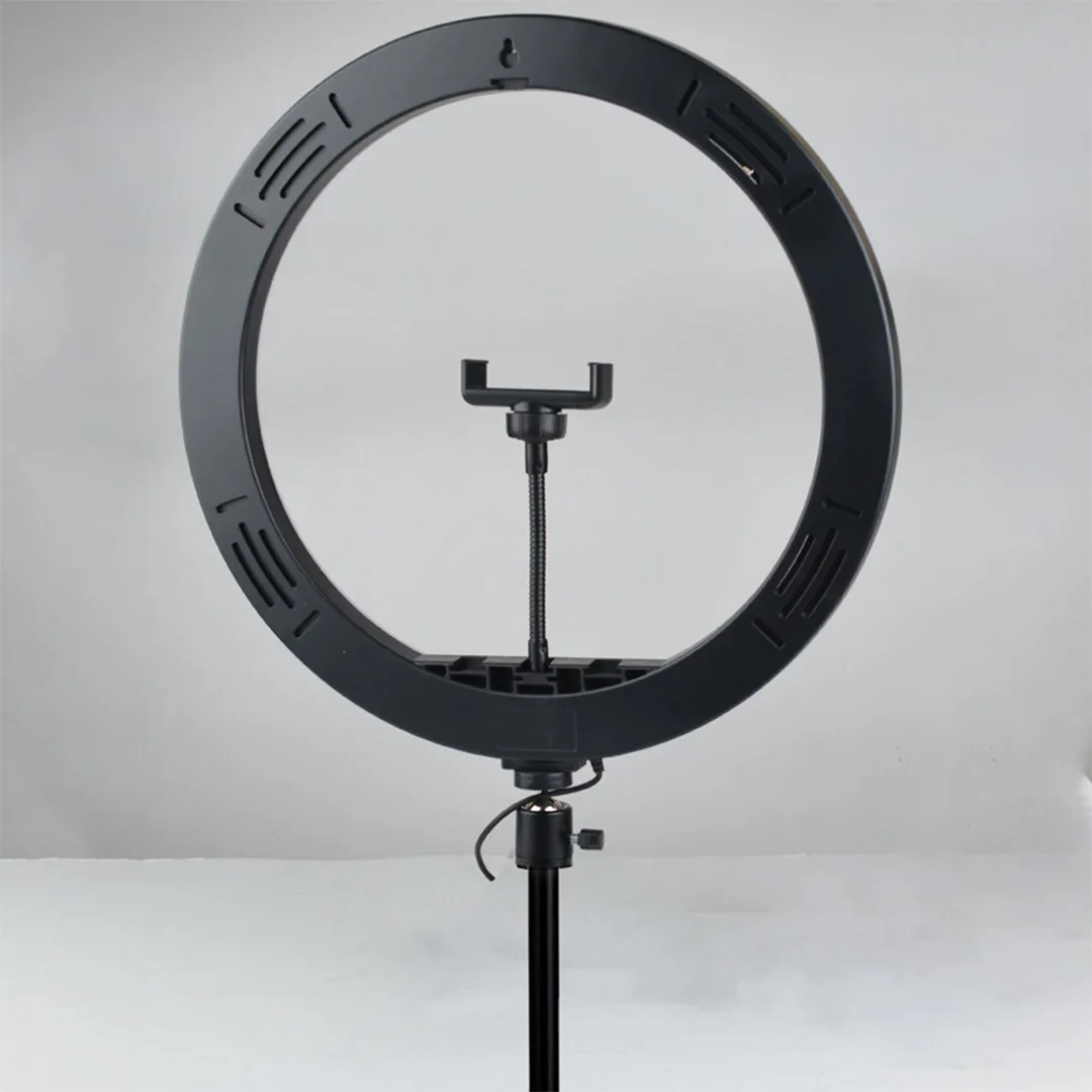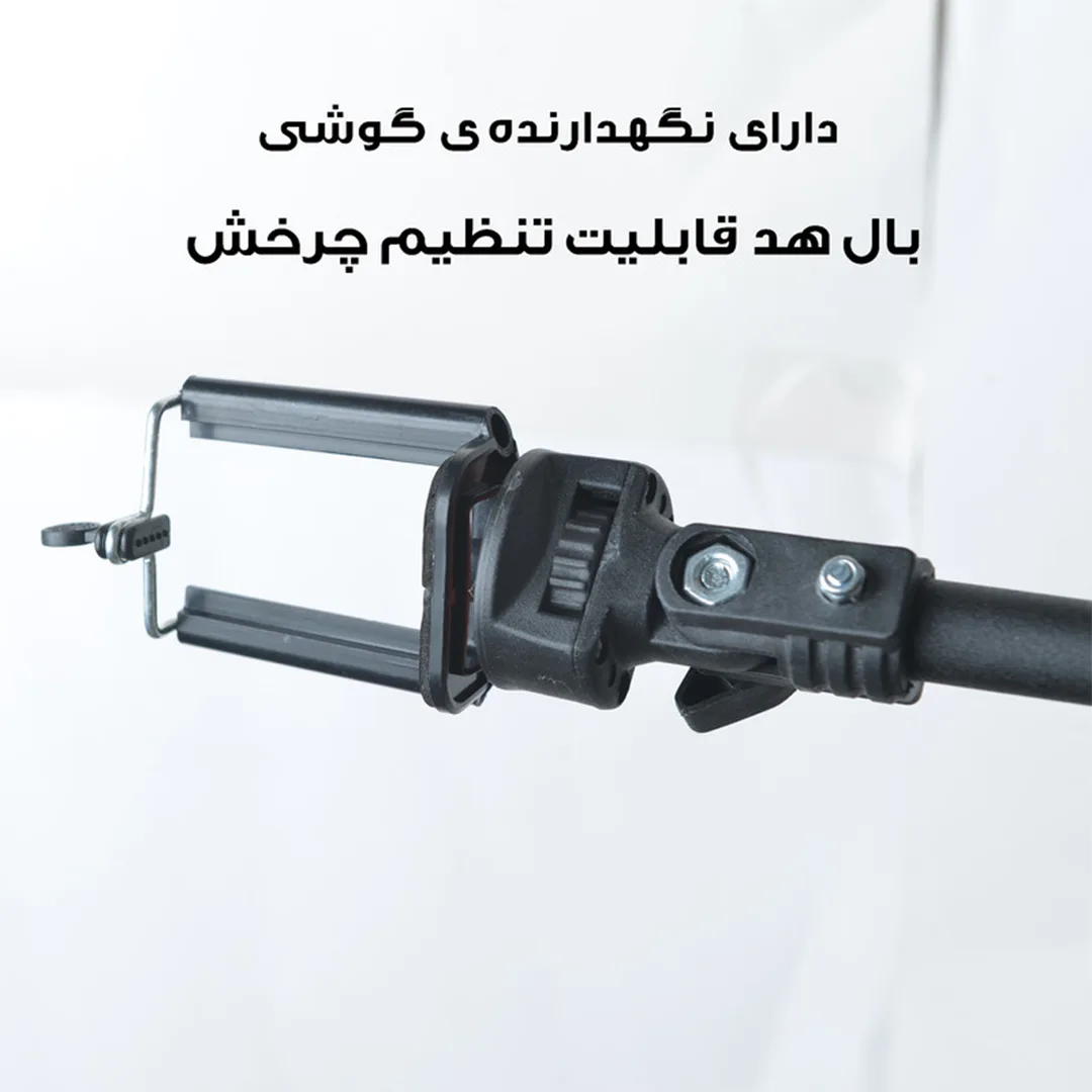 این رینگ لایت همچنین دارای سه عدد هولدر گوشی می باشد که به شما این امکان را می دهد تلفن های هوشمند خود را در زوایای مختلف قرار دهید و از آنها برای عکاسی یا فیلمبرداری استفاده کنید . این هولدر ها انعطاف پذیر بوده و قابلیت تنظیم زاویه دارند و می توانید آنها را به صورت افقی یا عمودی تنظیم کنید . این رینگ لایت با توجه به سازگاری با انواع گوشی های هوشمند در اندازه های مختلف ، گزینه ای مناسب برای کسانی است که دوست دارند با کیفیت بالاتر و حرفه ای تر اقدام به عکاسی یا فیلمبرداری نمایند . همچنین این رینگ لایت دارای یک پورت USB جهت شارژ نمودن گوشی های همراه میباشد.