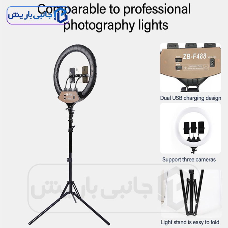 | قابلیت ها | قابلیت تنظیم کانال و گروبندی نور / 3 حالت نوری / دارای 2 عدد پورت USB / دارای 600 عدد چراغ LED / قابلیت نصب هم زمان 3 گوشی برای هولدرها / قابلیت چرخش 180 درجه هولدرهای گوشی / مناسب در برابر گرما ، ضربه و سرما / کنترل از راه دور |