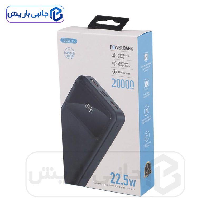 پاوربانک 20000 میلی آمپر وریتی مدل PP142-20PD یک پاوربانک قدرتمند است که می تواند دستگاه های شما را با استفاده از تکنولوژی شارژ سریع ، شارژ کند . همچنین ، دارای وزنی معادل 415 گرم و ابعاد 30*68*147 میلی متر است که نسبت به ظرفیت آن ، اندازه ای مناسب و قابل حمل دارد . رنگ این پاوربانک مشکی است که با طراحی ساده و شیک آن همخوانی داشته و دارای نمایشگر میزان درصدی شارژ پاوربانک است که می توان با نگاه کردن به آن ، میزان شارژ باقی مانده را مشاهده نمود .